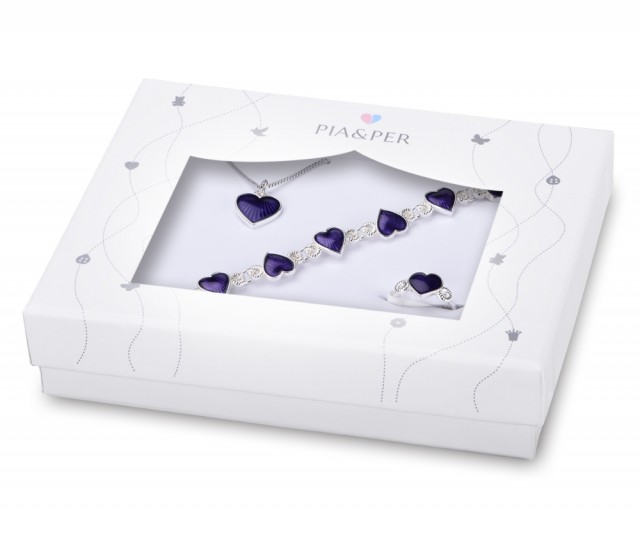Smykkesett med halssmykke (det nest minste hjertet), ring og helarmbånd i sølv og lilla emalje. Hjertene er blant våre mest populære smykker. Dette er en fin gave til dåp, navnefest og bursdag, med smykker barnet tar med seg gjennom livet. Smykkesettet leveres i en flott setteske.